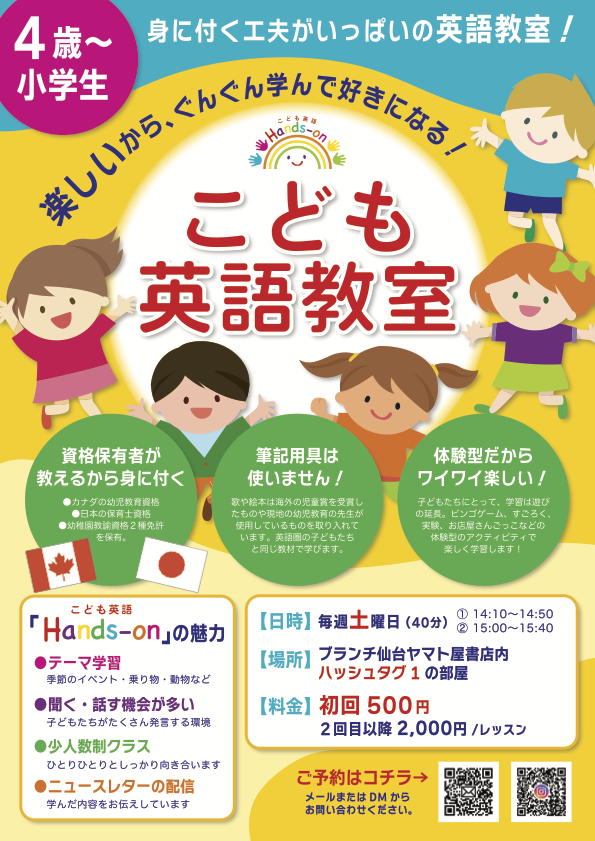 連絡先 | こども英語 Hands-on(こどもえいご はんずおん) kodomoeigohandson@gmail.com |